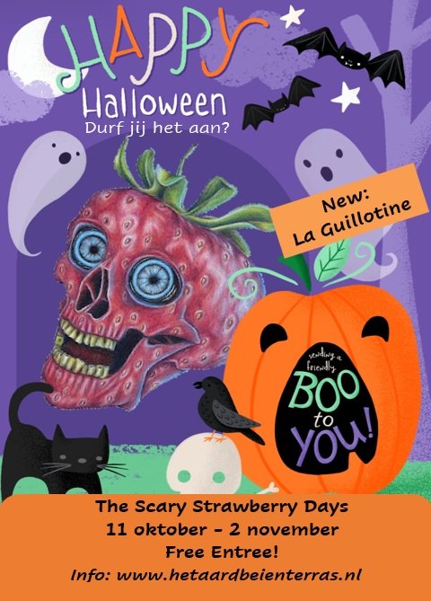 Van 11 oktober tot en met 2 november zijn de Scary Strawberry Days bij Het Aardbeienterras. Elke dag van 10:00 - 18:00 gezellig griezelen met onder anderen een Haunted House, Edward's graveyard, de Spider tree, Pumpkin Plaza, The Electric chair en nieuw dit jaar: La Guillotine.