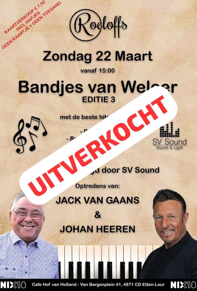 Op zondag 22 maart is er een themamiddag bij Zaal Roeloffs: Bandjes van Weleer. Met de beste hits van onder andere De Four Tak, Roland Konings Band, Highway, Pleasure, Jack van Gaans en Johan Heeren.