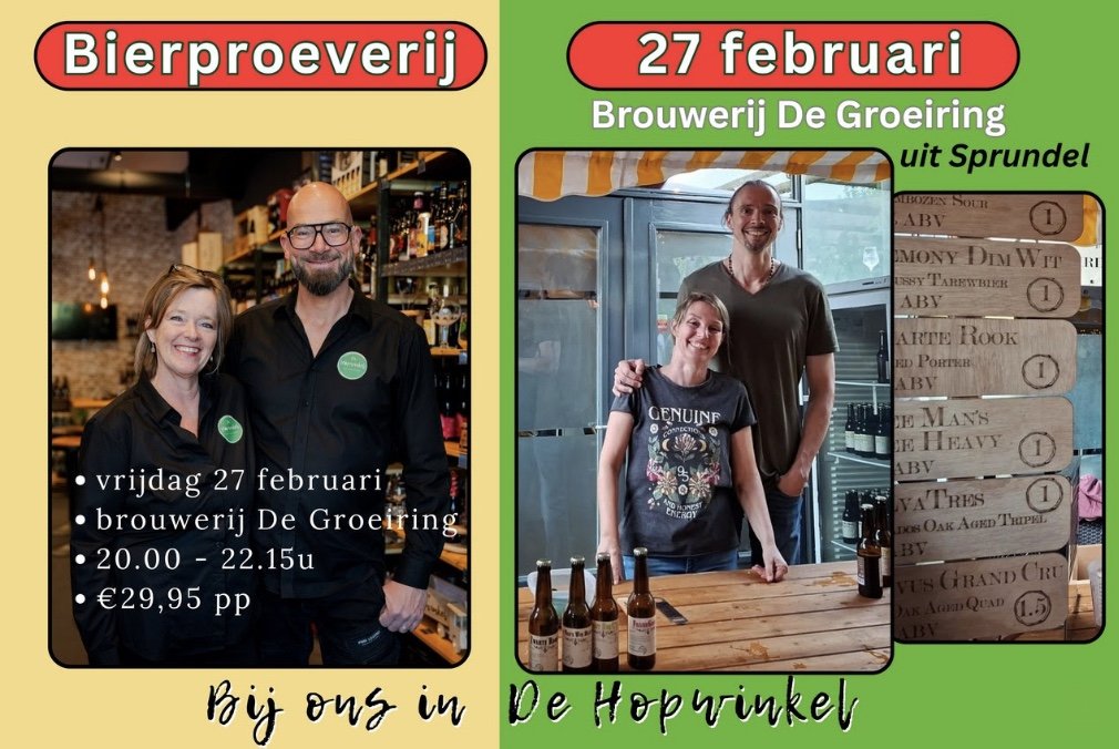 De Hopwinkel in Etten-Leur heeft voor 27 februari brouwerij De Groeiring uit Sprundel uitgenodigd om de bierproeverij van de maand februari te verzorgen.