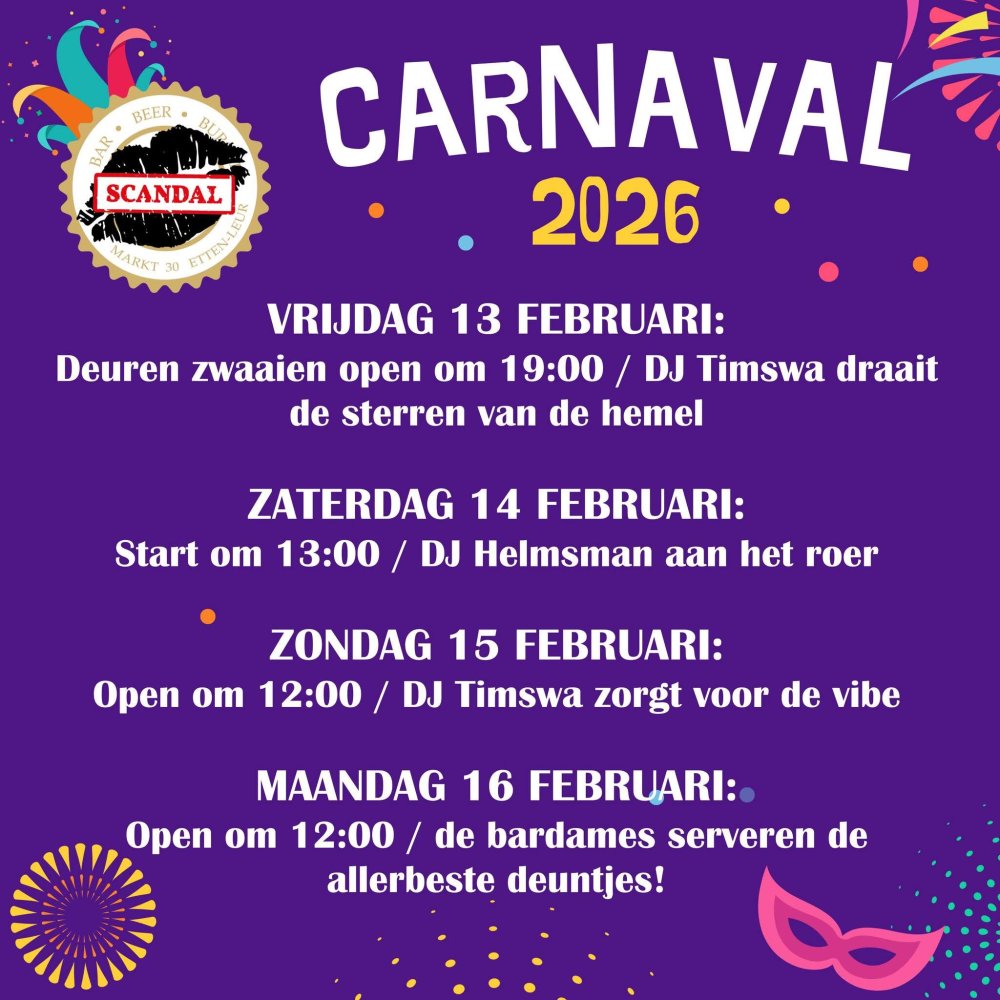 Vier vier dagen carnaval bij Scandal Bar op de Markt in Etten-Leur. Read more