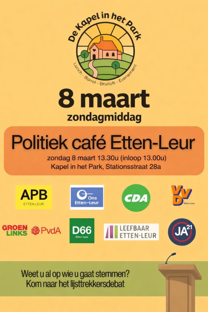 Op zondag 8 maart staat Etten-Leur in het teken van het lokale debat. In De Kapel vindt dan het verkiezingscafé plaats, een middag waarin inwoners rechtstreeks in gesprek kunnen met de mensen die onze gemeente de komende vier jaar willen besturen. Indirect bepalen we daarmee ook welke partijen de nieuwe wethouders leveren die samen met de burgemeester de bestuurlijke leiding vormen. Opvallend dit jaar: de raad groeit met twee zetels. Etten-Leur zit inmiddels al twee jaar boven de 45.000 inwoners en dat betekent automatisch een grotere gemeenteraad. Daarnaast doet er dit jaar een nieuwe partij mee aan de verkiezingen. Na jarenlang zeven partijen op het stembiljet te hebben gehad, kunnen inwoners nu ook stemmen op JA21.