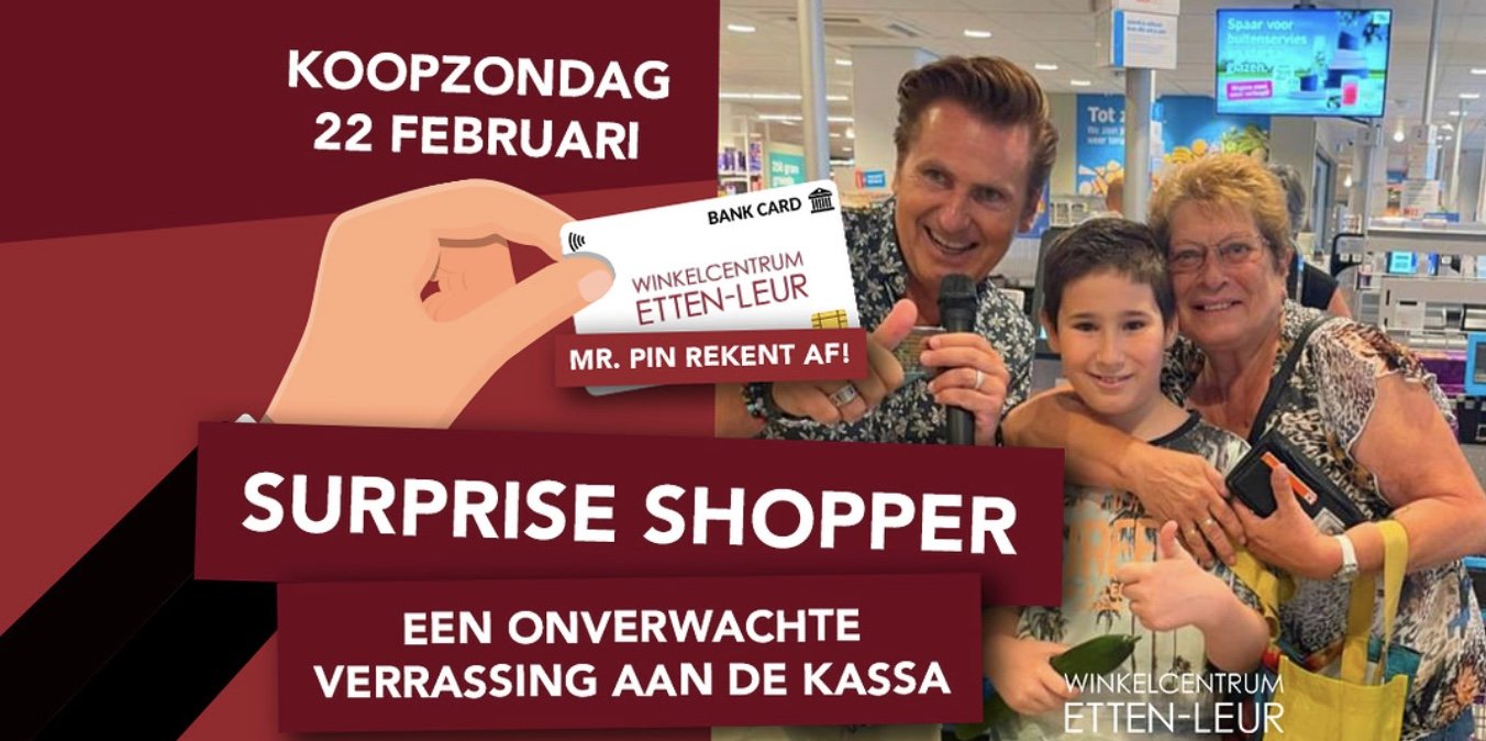 Zondag 22 februari belooft een koopzondag te worden die je niet snel vergeet. Tijdens deze extra koopzondag, van 12:30 tot 16:30 uur, wordt winkelen in Winkelcentrum Etten-Leur extra bijzonder. Bezoekers maken namelijk kans op een onverwachte verrassing aan de kassa dankzij de unieke act Surprise Shopper Mr. Pin. Een middag vol verwondering, plezier en spontane geluksmomenten staat centraal.